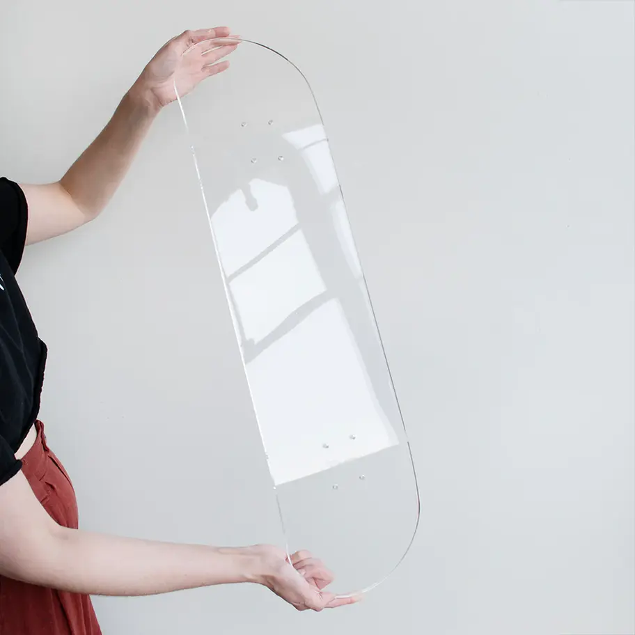 5mm thick acrylic skateboard deck, perfect for wall art, painting, or creative displays. Comes with matching acrylic wall mounts and screws for easy setup. Sleek, modern look – great for decor, DIY projects, or unique room styling.
